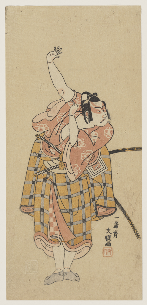 Ippitsusai Bunchō, Actor Ichikawa Yaozō II as Umeōmaru in the play Sugawara denju tenarai kagami (Sugawara’s Secrets of Calligraphy), 1768, color woodblock print on paper; nishiki-e, The Mary Andrews Ladd Collection, public domain, 32.160