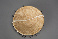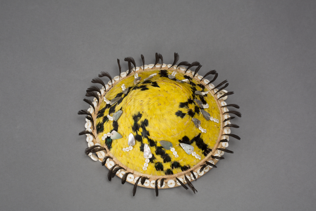 Feathered baskets were an important trade item and a symbol of wealth among the Pomo. They were considered appropriate gifts at special occasions and were used as offerings at funerals and mourning ceremonies. The brightly colored feathers, added to the basket as it is made, provide a design mosaic, while the basketry foundation is left plain. Flat saucer-shaped hanging baskets, like this one, were originally decorated only in red feathers. The addition of other colors and patterns was an innovation that began around 1900 as a reponse to collectors' wishes. Handmade clam shell beads added around the rim along with triangular pieces of abalone shell as pendants increased the traditional value of the basket. Magnesite beads were sometimes used as an alternative to clam shell beads. Referred to as "Indian gold," magnesite is white when it comes out of the ground. Pomo men would ceremonially heat it over a fire - causing the magnesite to turn a golden orange color - before working it into beads.