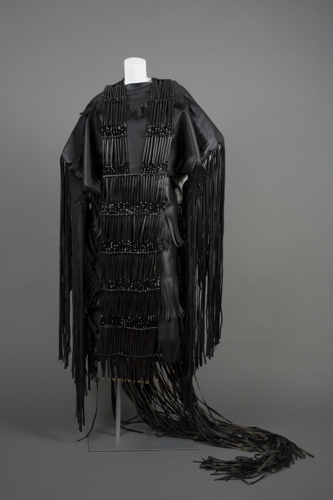 Wendy Red Star, síkahpoyíí / bishée / baleiíttaashtee (Motor Oil Buffalo Dress), 2013, vinyl leather, polyester thread, horn, glass and brass beads, and leather on faux sinew, Museum Purchase: Funds provided by Barbara Christy Wagner, © Wendy Red Star, 2014.19.1a-c
