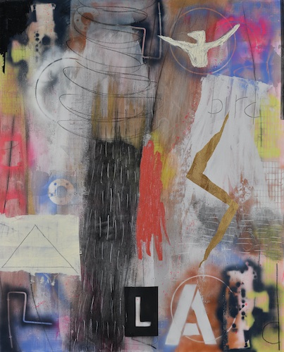 Acrylics, Painted Hills wild red, Klamath charcoal, aerosols, graphite, oil bars on wood panel